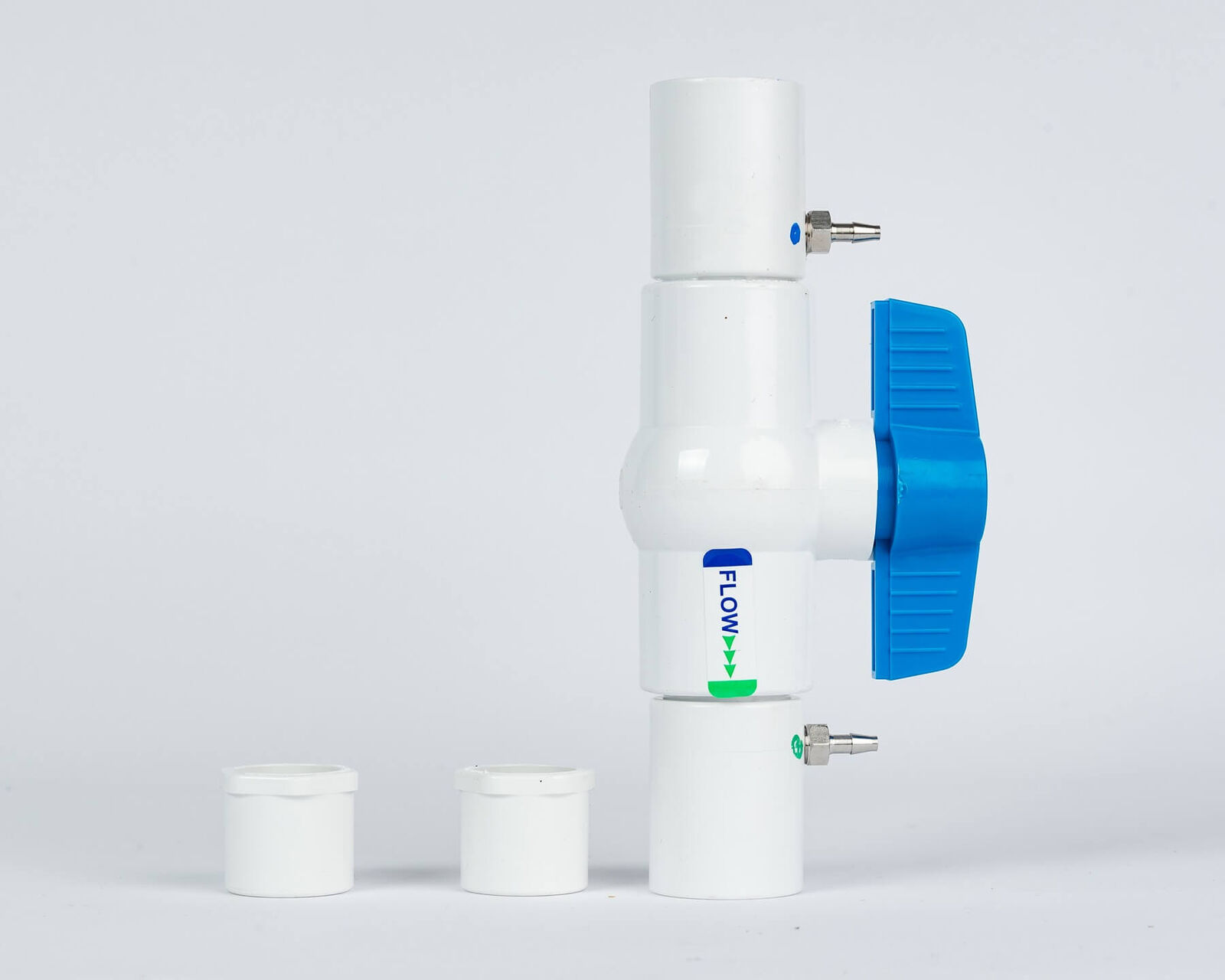 EZ-FLO requires either a hose tap adapter for residential systems or for permanent irrigation a main inline adapter (CBV). These provide a slight pressure drop allowing a small stream of water from the hose or irrigation pipe to enter the EZ-FLO, displace the fertiliser concentrate, then re-introduce it back into the main water stream where it is diluted.