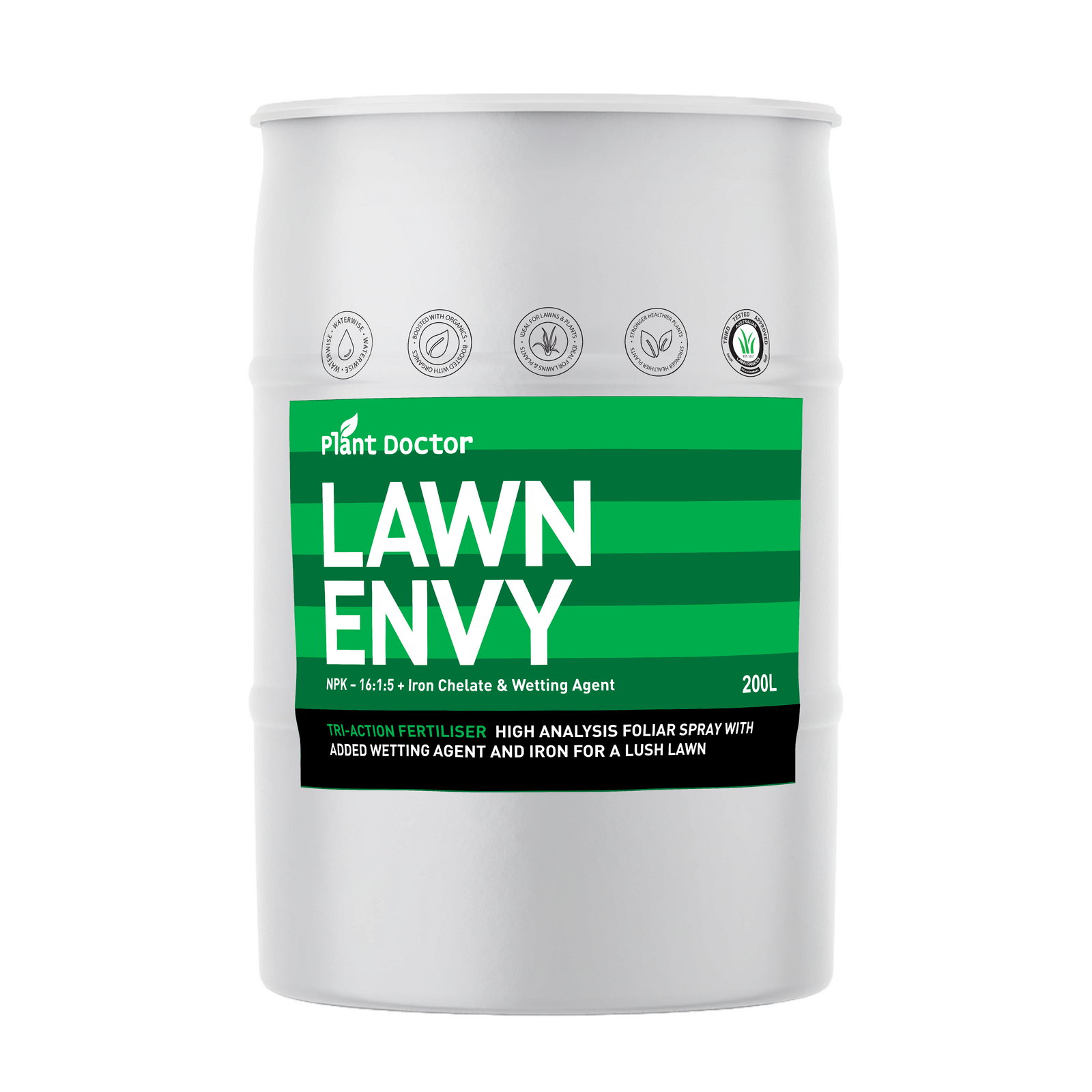 Lawn Envy is a high-performance liquid turf and soil conditioner designed for professional use across commercial landscapes, sports turf, council assets, estates, nurseries, and broadacre properties. This concentrated formulation integrates multiple proven Plant Doctor technologies into one easy-to-use commercial blend, reducing labour, simplifying inventory, and improving application efficiency at scale. Engineered for Australian conditions, Lawn Envy enhances turf colour, improves soil structure, increases water penetration in hydrophobic profiles, and accelerates root development. It is compatible with boom sprays, fertigation systems, ride-on sprayers, and irrigation injection setups, including EZFLO.