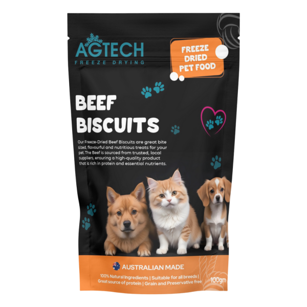 Freeze-Dried Beef Biscuits made from 100% Organic Australian Beef. Rich in protein and essential nutrients, promoting dental health and suitable for both dogs and cats. Contains 10% vegetables & rice all in little bite sized bits.