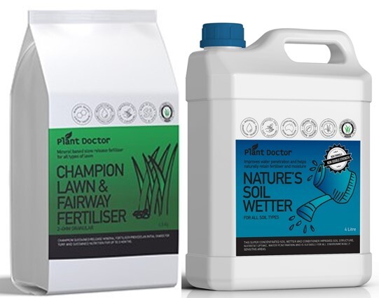 Nature’s Soil Wetter fixes hydrophobic soils by improving water penetration. Champion Fertiliser strengthens the lawn and promotes lush, even growth, reducing patchiness and bare spots.
